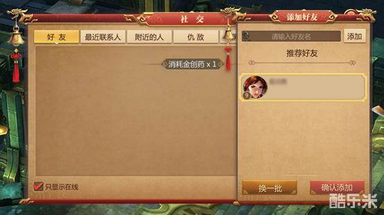 在主界面下方的社交-好友界面,可以添加好友。点击下方的“添加好友”按钮,可以看到当前在线的玩家,可以选择某个玩家后点击右侧的“确认添加”。如果已知好友的名字,也可以在上方输入好友的角色名进行精确查找。平时组队或者做任务的时候,遇到志同道合的玩家,也可以点击其头像,在下拉菜单中选择 “加为好友”。
