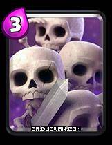 卡牌简介:骷髅军团是一张3费的史诗军队卡牌,这张卡在训练营即可解锁,可以召唤大量的小骷髅(14个),所以有着非常不错的解卡能力,特别是在低阶竞技场中更是一个百搭的卡,使用率极高,而在高阶竞技场中由于哥布林团伙有着一定的替代能力,并且更为的灵活,所以使用率则是一般。