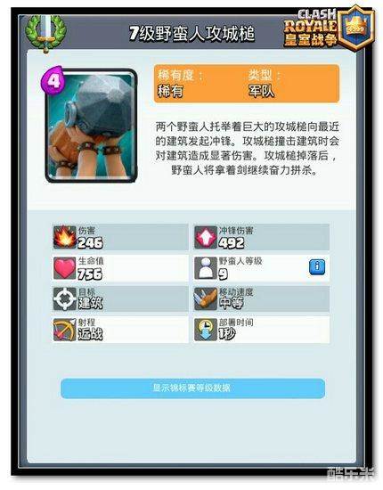 野蛮人攻城槌是目前使用率较高的一张卡牌,他甚至有点像野猪骑士,进攻搭配灵活多变,是一个不能不防的先锋肉盾,摧毁后爆出来的野蛮人也可以充当肉盾和提供输出,是一张非常优秀的肉盾和避雷针。