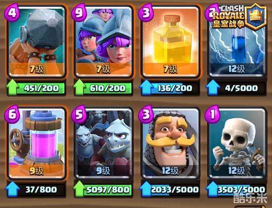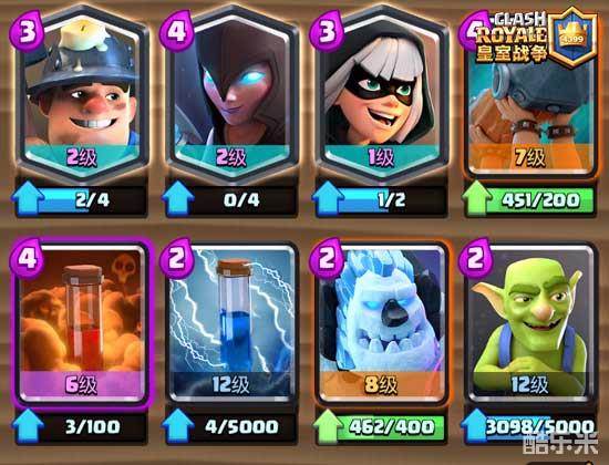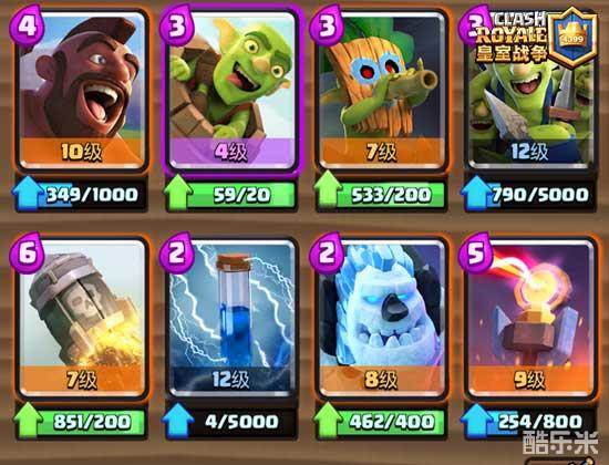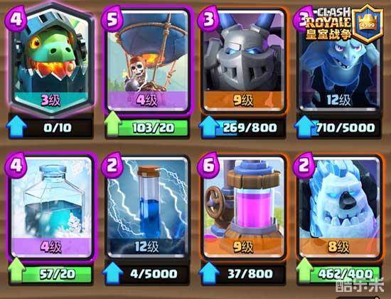 这套牌的问题是比较吃等级,尤其是冰冻,这是唯一一张在不同等级时与同等级卡牌进行交换时效果会有所不同的牌,满级的冰冻要比四级冰冻强度高很多,因此挑战里不能发挥出这套的正真实力,等级够的话最好去天梯试试。