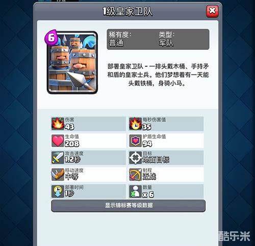 6费、白卡(普通品质)、部队卡、6个单位、只能对战,近战,带护盾,19天后解锁(本周会开新卡挑战活动,提前解锁)。