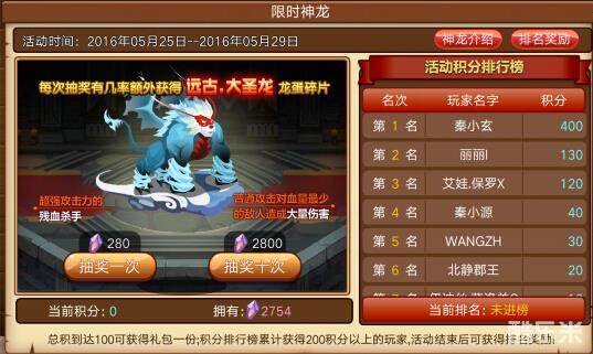 无论是单次抽奖还是十连抽,玩家都有机会获得远古·大圣龙的龙蛋碎片,并且可以获得积分,总积分达到100还可以获得礼包一份。在限时神龙活动中有“活动积分排行榜”,玩家在积分排行榜累计获得200积分以上的玩家,活动结束后还可以获得排名奖励。