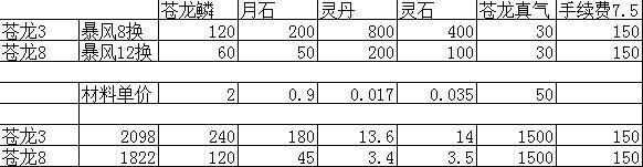 苍龙真气,50J算的,正持续跌价中,苍龙鳞按2J算的,目前也是跌价中,成本只会更低。