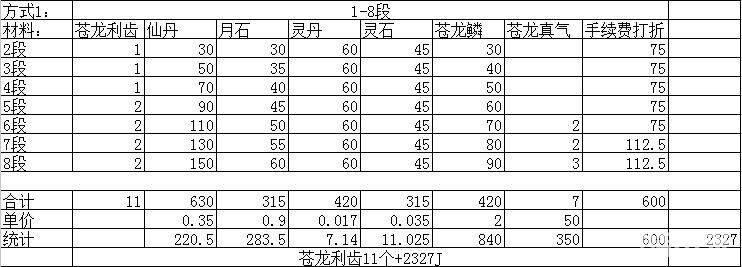 方式1 兑换1段 升到 苍龙8段成本:利齿42个+(算上1段兑换) 1200 + 2327 +150 +22个高级武魂