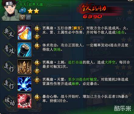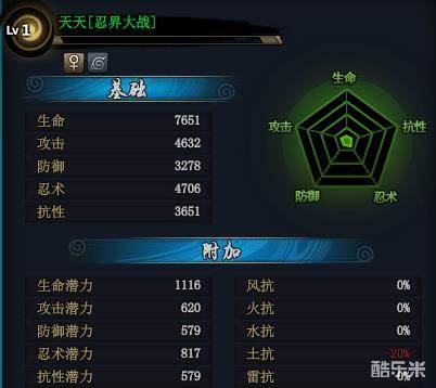 1级没觉醒的忍天5围其实是相当平均的,忍术偏高,标签少,只有木叶标签能用。