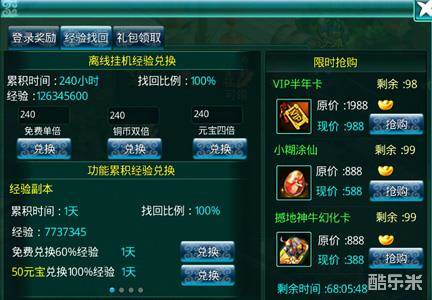这里可以累积所有你不在线时的经验,通过铜币,元宝可以兑换不同的找回经验比例,通过上图你就可以看到啦!!这是非常逆天而贴心的设置啊!!