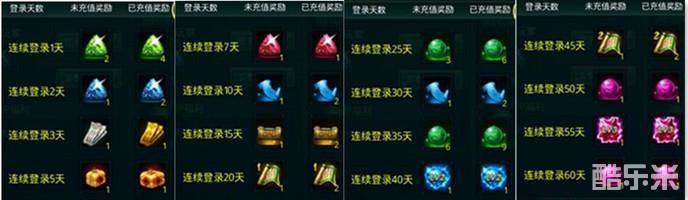 这里可以根据自己的需求,看着不同登陆天数的奖励,随时将自己的登陆天数清零哦!这可在其他网页游戏中不曾看到过的贴心和独特呢!点击查看登陆奖励,可以看到不同天数的登陆奖励!而且,未充值和已充值的登陆奖励是有数量上的不同哦!谨记谨记!