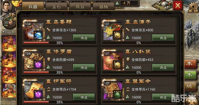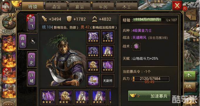 典韦:山地将领,在本次战役中担当第四重要武将。典韦的战法是天谴旋风。在这里小编给典韦穿的是散装,给他带的还是双14的夜光杯。