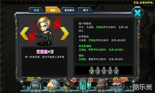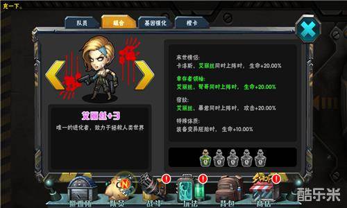 例如初始角色之一的艾丽丝,她的人物组合有四个:僵尸调查组、末日世情侣、幸存者领袖和宿敌,每个组合所对应提升的属性都不同,所以激活的属性越多,艾丽丝的战斗力越强。