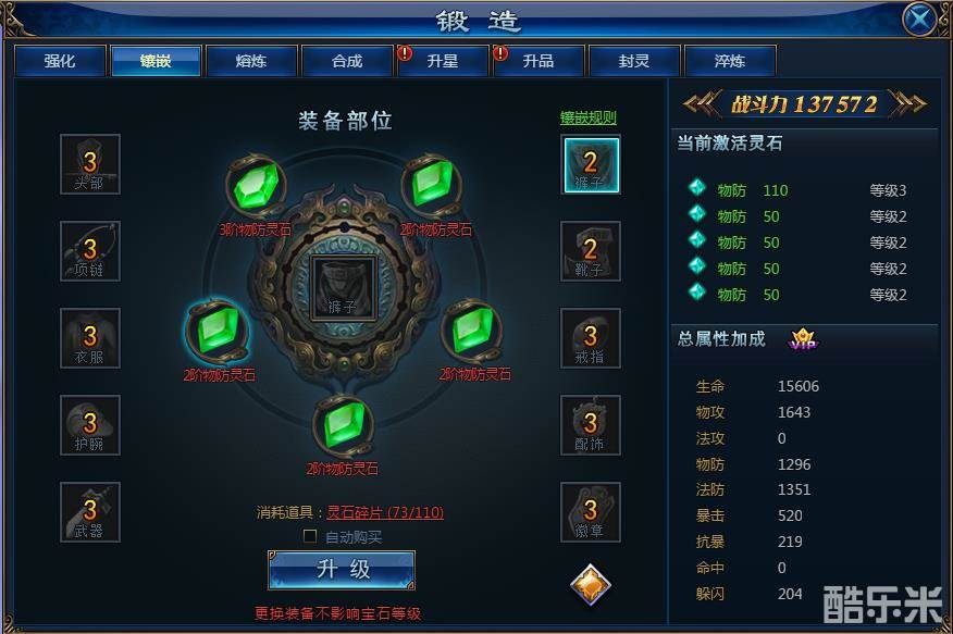 1、消耗灵石碎片,可对部位进行镶嵌;