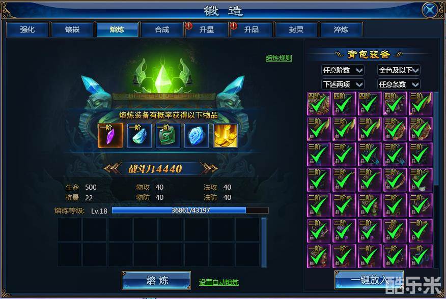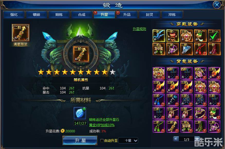 3、装备熔炼后100%返还升星时消耗的升星石;