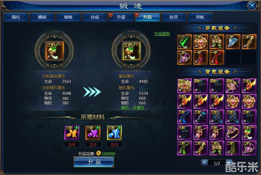1、消耗对应材料可对装备进行升品,升品提升装备品质;