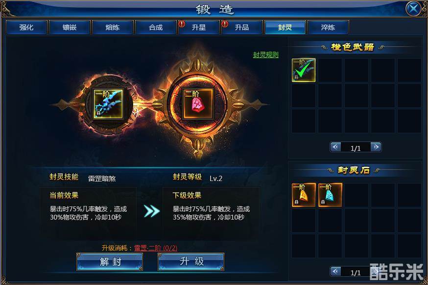 1、只能对未封灵的橙色品阶以上装备进行封灵操作;