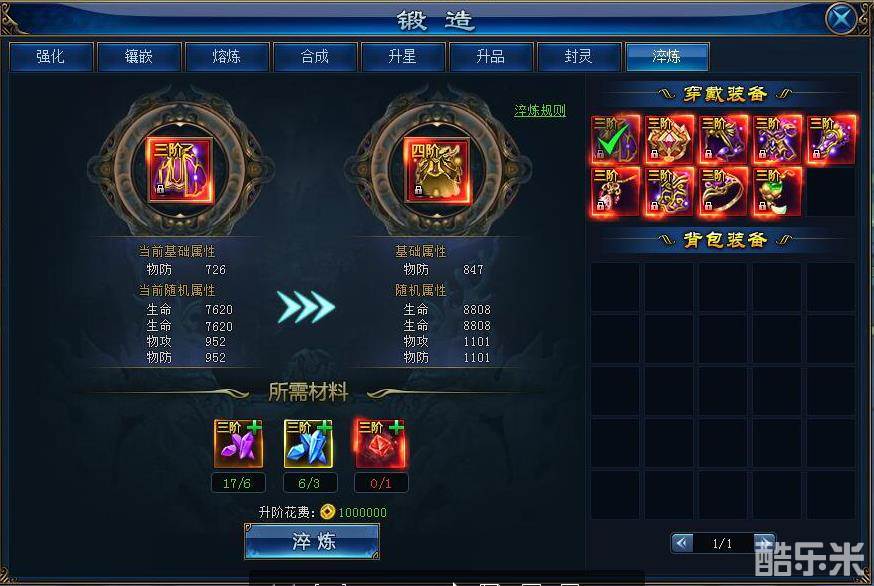 1、淬炼可提升装备阶数,仅红色品阶装备可以淬炼;