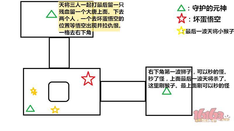 两个地府下去,一个去刷坏蛋悟空的位置,等待坏悟空出现并拉仇恨溜悟空(游击战),右下角地府杀死右下角第一波可以秒的狮子,然后上边的大唐杀死