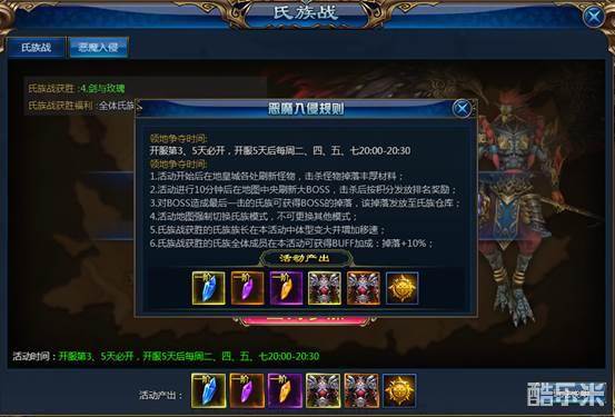 6、氏族战获胜的氏族全体成员在本活动可获得BUFF加成,掉落+10%。