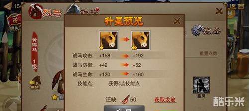在成功领取战马后可通过喂养的方式来提升战马的等级,每种类别的战马所需要的食物也各不同。由于战马需要升阶至成年马匹才能乘骑作战,所以提升星阶就很关键,在收集到相对应的材料时,玩家需通过试练挑战才能提升战马星级,而当达到满星时就可与征服美女相同进行战马征服,让其成为你的作战脚力。