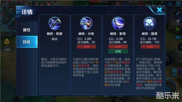 技能解析:大招是兰陵王能够gank成功的关键,超长的隐身时间可让兰陵王神不知鬼不觉地接近敌人,从而完成击杀!且大招也是兰陵王的唯一位移技能,能够在危急时刻帮助兰陵王化险为夷,逃出生天。