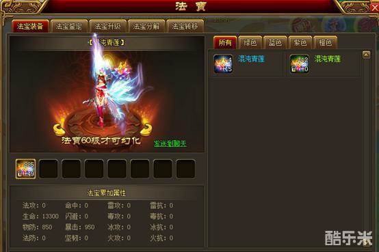 b. 法宝颜色:从低到高分为“绿、蓝、紫、橙、金”5种颜色,越高级的颜色属性越好;颜色在获得法宝时即确定,不可更改