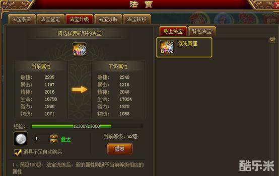 b. 同种类法宝才可转移,转移将使目标法宝完全继承被转移法宝的等级数,且被转移的法宝不会消失