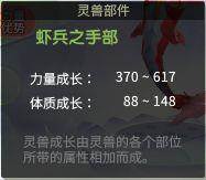上图的虾兵带力量属性的部位有三个:触角174/198,手部456/617,尾巴166/198,分别加起来就是力量成长796/1013,这里的上限是根据部位对应的灵兽的部位上限而定。