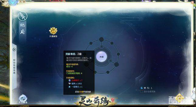 玩家达到升级条件并具备足够的升级消耗的材料时,用鼠标左键点击“升级”即可升级灵脉获得修为。