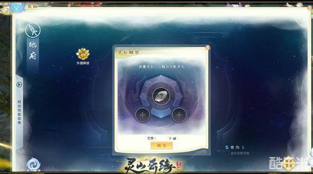 玩家点击“灵石融合”,出现以下对话框,放置两个灵石使他们融合为新灵石。灵石分为绿色、蓝色、紫色、橙色四种品质,融合的同时需要花费灵石和银两,融合后可以增加技能效果。灵石可以在玲珑塔处获得。