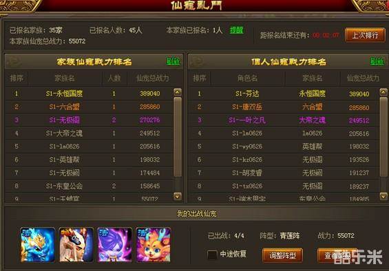 d. 报名成功后,可在界面中部查看已报名的家族、个人的仙宠战力排名,知己知彼
