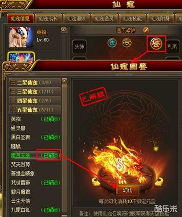 b. 打开【仙宠图鉴】界面,选择已解锁的仙宠