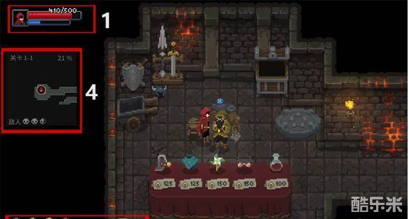 在主角受到攻击后,生命值会降低,它可以通过购买地下城中商人的药水进行恢复。