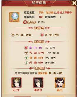 这是一把扇子,我却给了婉儿,原因就是四条随机属性有两个还是不错的,符合婉儿!基础属性也符合婉儿所需。我包里还有一个婉儿的珍宝天阶却没用,因为那个珍宝随机属性就像我上面说的,完全不符合,全是加的攻击!切婉儿的珍宝情缘激活加的也是攻击,更是宋江军师的军师!还有一点,像婉儿,潘安,李白等等,这几个随从的珍宝大家不用刻意去追求情缘珍宝。这几个随从可以通用其它珍宝,比如李白用华佗的珠子,潘安用项羽的伞。只要随机属性好,那就是正确的选择。你们也许还要问,我婉儿带个扇子不影响人物整体属性吗?我想告诉你的是,不影响,请看下图