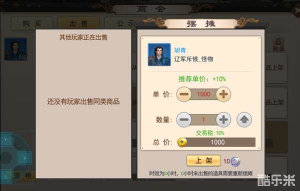 4.商品出售:商品出售推荐单价+10%,交易税也要交10%,手续费是10个银币。