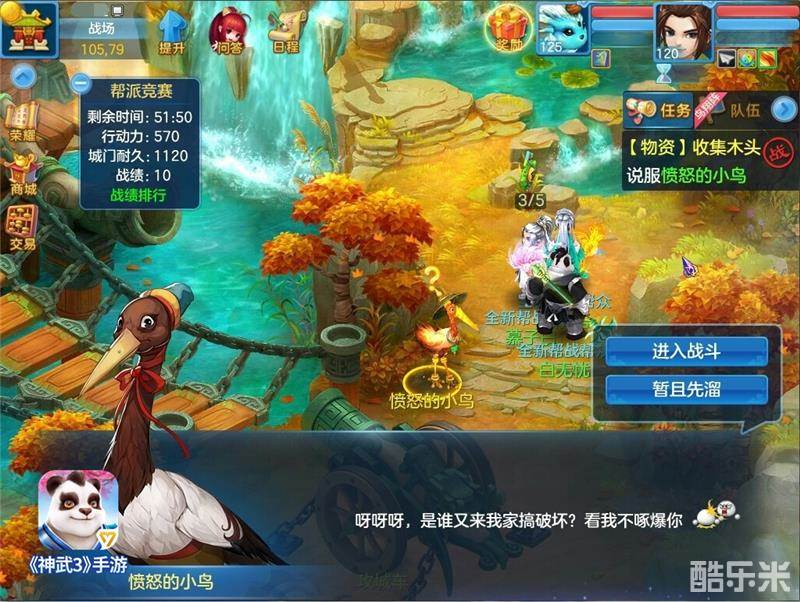 第二种任务要求你到指定的地点伐木取材,到达指定地点进行短暂的读条后,有可能直接完成任务或者被愤怒的小鸟袭击,战斗胜利后完成任务,此战难度不大。