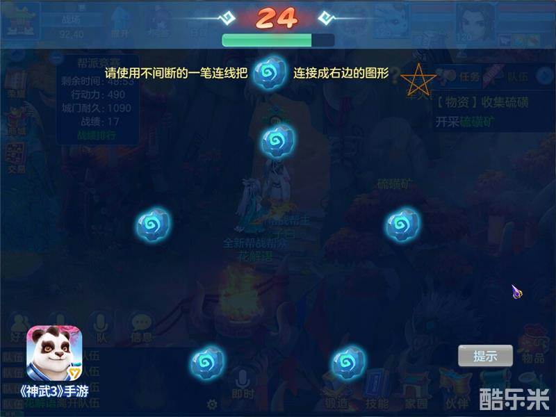 第三种任务要求你到指定的地点开采硫磺矿,到达指定地点后进入小游戏,该游戏需要用一笔不间断的连线将图案连接成任务要求的形状。队伍中有3名成员完成连线时,任务完成。