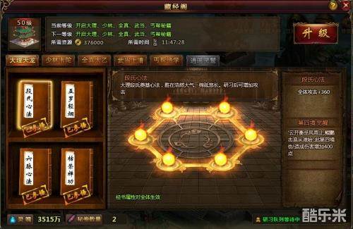 藏经阁的等级影响经书的数量和加成属性。前一门派武功秘籍全部研习至紫色品质后方可开启后已门派武功秘籍。