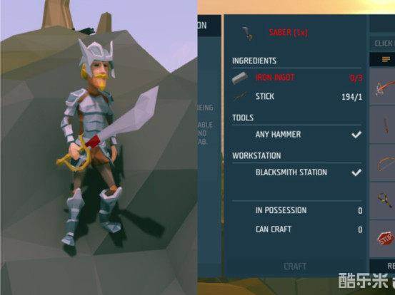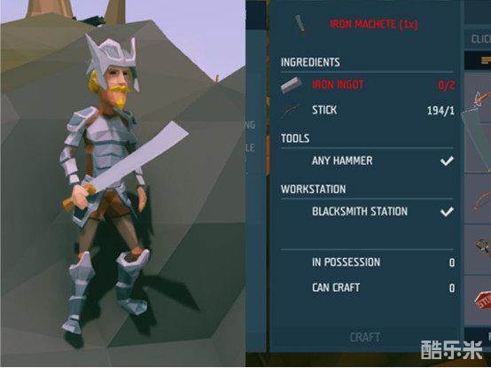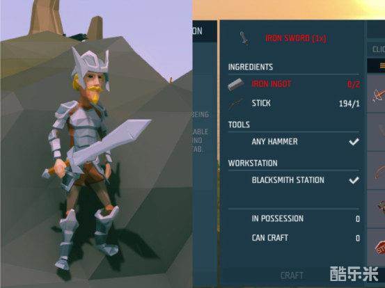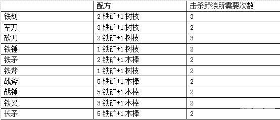 铁剑,配方2铁矿+1树枝,以岛上最容易见到的狼作为对手,铁剑至少需要3下才可以击杀狼。