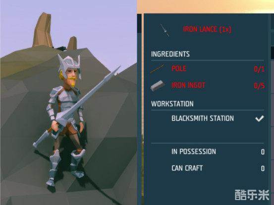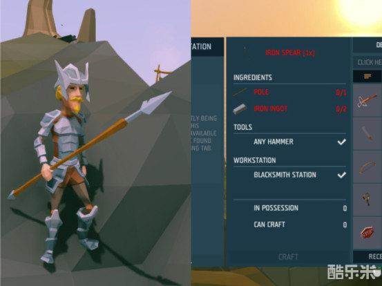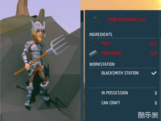 铁叉,配方3铁矿+1木棒,以岛上最容易见到的狼作为对手,铁叉至少需要2下才可以击杀狼。