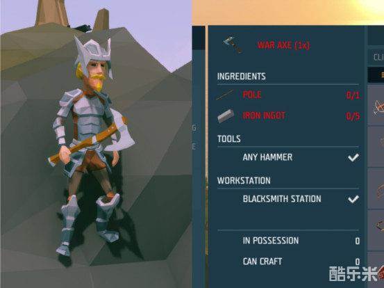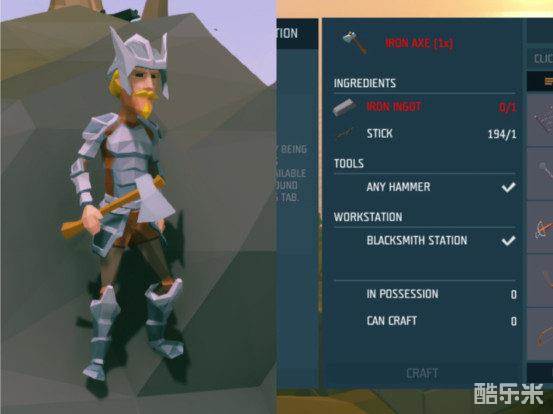 铁斧,配方1铁矿+1树枝,以岛上最容易见到的狼作为对手,铁斧至少需要2下才可以击杀狼。