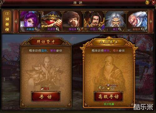 【玩法】 1、寻访有寻访以及高级寻访两种形式;“寻访”有概率获得蓝色、紫色豪侠;“高级寻访”有一定概率获得紫色、橙色豪侠。 2、玩家每天有免费1次高级寻访; 3、每天寻访可获得大量的兽灵石、淬元灵果等游戏道具。