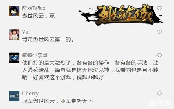 来自霸业1-256服的傲世風雲,作为最老服务器的最强公会,一直都是《烈焰龙城》神话般的存在,云集了众多高战大佬。傲世風雲的前身是首届跨服联赛亚军風絕雲殺,首届比赛之后他们招贤纳士进行了重组,终于在第二届跨服联赛中勇夺桂冠!本届比赛傲世風雲仍是大家眼中最大的夺冠热门,这一点在《烈焰龙城》的微信留言中可见一斑——