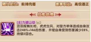 主动技对敌方单体造成自身攻击248%+146的伤害,并使自身受到伤害减少28%,持续两回合。从技能面板上来看,造成的伤害跟另一个橙色侍卫—荆轲完全一样,但区别在于附带的效果。荆轲主动技的效果是使被攻击的目标造成伤害减少30%,而项羽是使自身受到伤害减少28%。