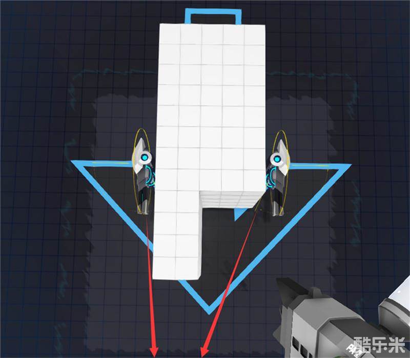 这种设计能让枪座免受某个方向的伤害影响,布局方式并不唯一,也不仅限于隔离一面伤害。这种处理方式非常简单,效果也不俗。不过,既然隔离了某个方向的伤害,那就说明枪座连接的方块少了。如果被击中没有伤害隔离的那一边,武器底座依然很容易被毁。