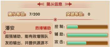 阵容搭配方面,因为潘安的定位就是辅助,所以比较百搭。就看小主们选择走什么路线。如果说走高输出一波流,那么就上阵狄仁杰+怡亲王(或李白),这种搭配可以在第一轮大招释放后就将敌方目标收割的所剩无几。如果说走消耗流,那么就上阵林黛玉或者宋玉。其他控制流也可以尝试,但小编比较推荐高输出一波流,毕竟29%的增减伤仅持续一回合,目的就是将学士的大招伤害最大化。