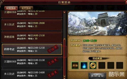 日常活动经验奖励不多,只有每日12:00-12:30进行的科举考试才有经验奖励。奖励多少根据在科举考试中获得的分数决定。笔者分数还没进过前十,所以一般只能拿到几万的经验。如果能进到前十,相信经验奖励会更多。