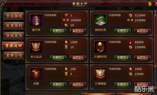 奖励大厅中有一个资源追回系统,玩家可以免费或者消耗修行纹章追回未上线的经验、道具奖励。免费追回只能拿到一半奖励,但是高级追回可以拿到全部,一次几十万的经验也是很丰厚的。