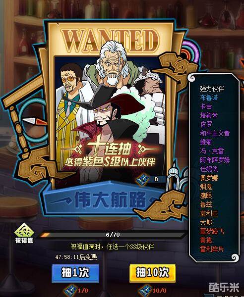 招募还有一个“祝福值”,每次招募都有1点祝福值获得,满了70点,可以在6个ss级伙伴中任意挑选一个,不过还是那句话,量力而行就好。