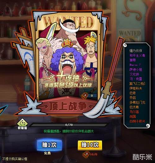 之前我们介绍过伟大航路招募,与其不同的是,顶上战争招募有等级要求,貌似是在35级才开启的,顶上战争招募的就比伟大航路的更加多的伙伴,例如多弗拉门戈、巴杰斯还有稀有的马尔高、战国、白胡子等等,都是顶上战争出现的伙伴,大部分都可以招募了,战力必然不容小觑。