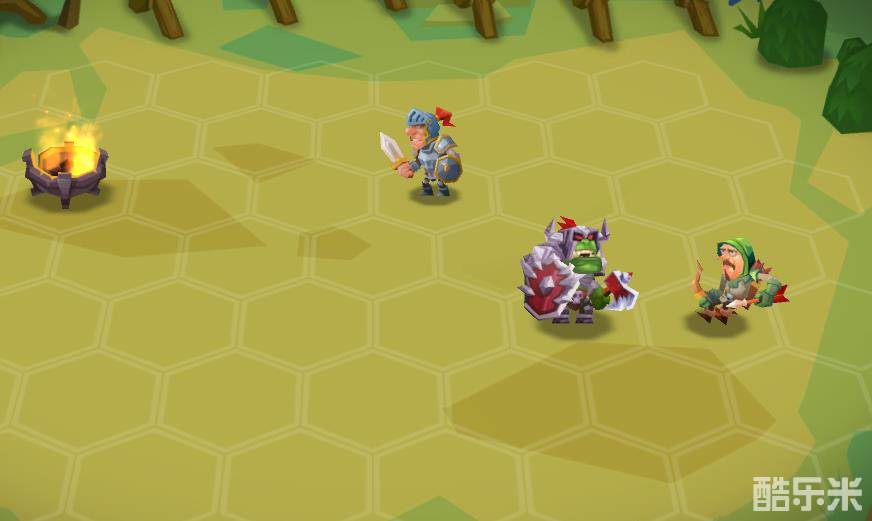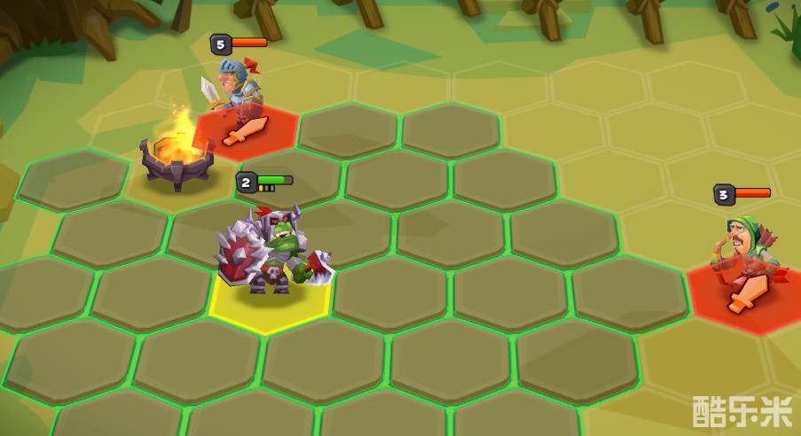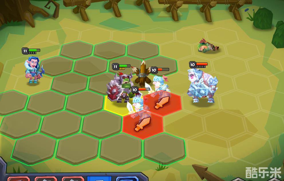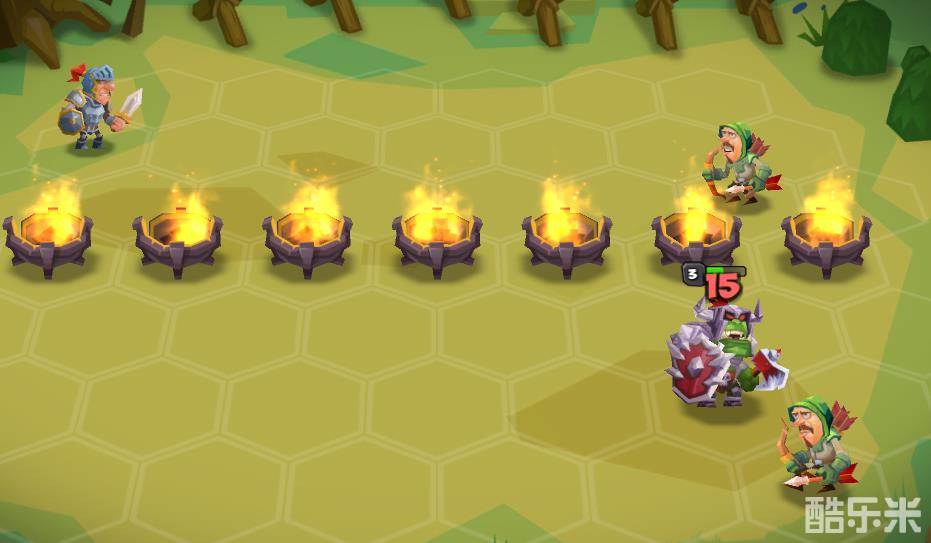 寒冰射手先攻击对面弓箭手,兽人走到如下的位置,这个位置可以把3个敌人聚在一起,卡住熊的攻击位。