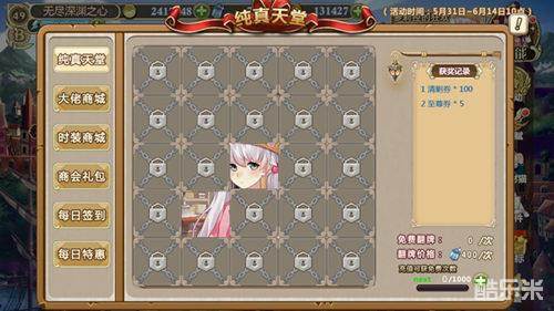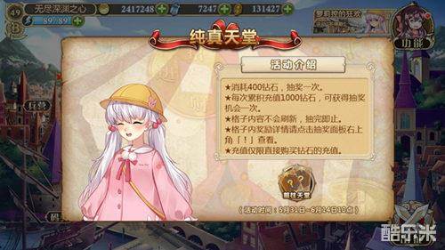 通过萝莉控的狂欢按钮进入界面---纯真天堂。消耗400钻可以翻牌一次,活动期间充值可获得免费次数,拼图大小为5x5,内藏5个【小莉幼稚园装碎片】,全部集齐可合成【小莉幼稚园装】。