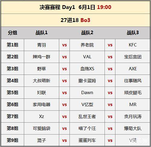 6月1日晚19点,公开赛第二季迎来决赛大战,27强交锋即将进入白热化!决赛首轮对阵安排如下: